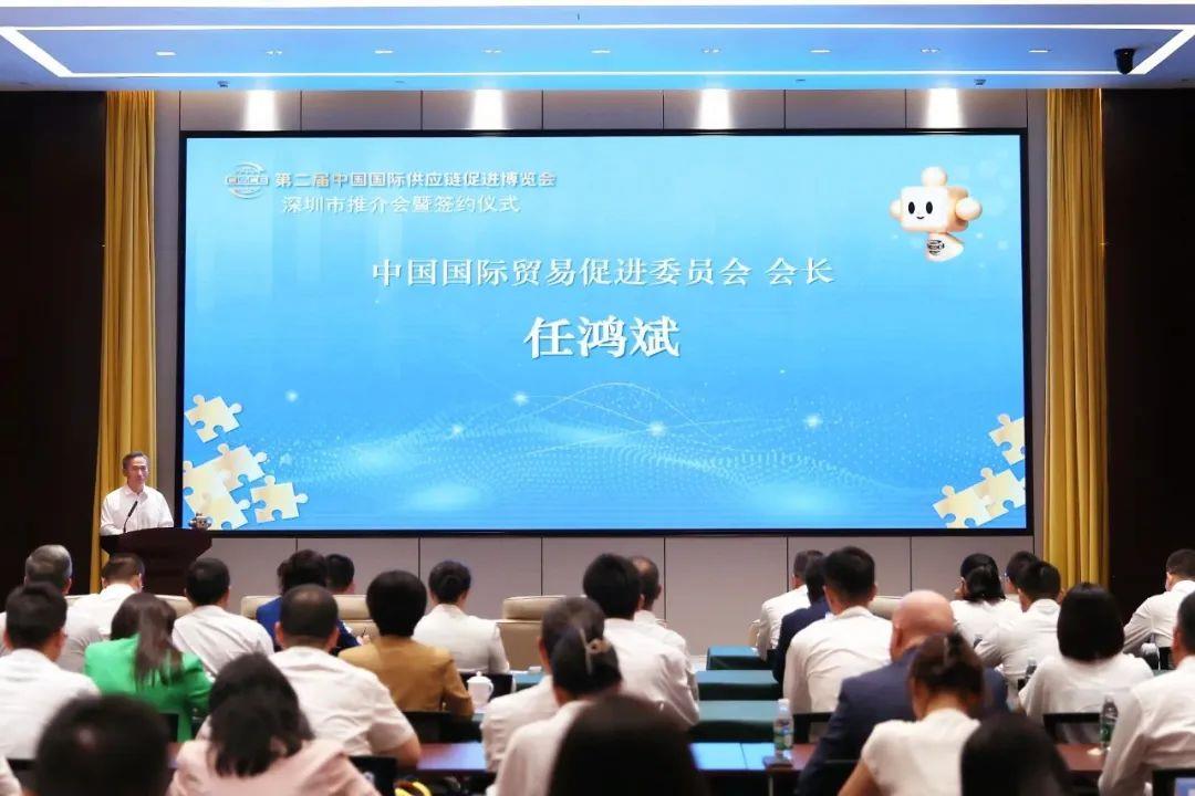 第二屆中國國際供應鏈促進博覽會(以下簡稱“鏈博會”)深圳推介會暨簽約儀式7月11日在深舉行。中國貿(mào)促會會長任鴻斌、深圳市副市長代金濤共同出席會議并講話。