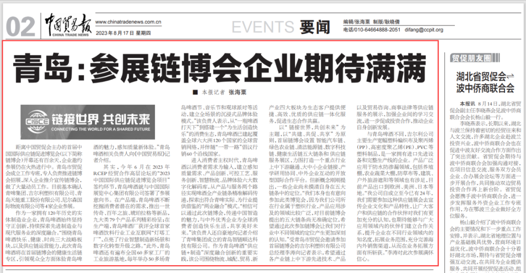 距離中國貿(mào)促會主辦的首屆中國國際供應(yīng)鏈促進(jìn)博覽會(以下簡稱鏈博會)開幕還有百余天,企業(yè)邀約參展仍在火熱進(jìn)行中。青島市貿(mào)促會成立工作專班,專人負(fù)責(zé)推進(jìn)鏈博會招展,深入企業(yè)推介宣傳鏈博會,做了大量動員工作。目前基本確認(rèn)青啤集團(tuán)、吉爾利塑織有限公司、青島天能重工股份有限公司、尼爾森國際物流有限公司等4家企業(yè)參展。