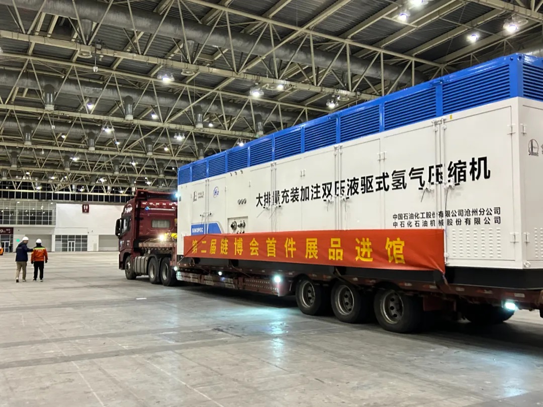 11月18日,第二屆中國國際供應鏈促進博覽會(以下簡稱“鏈博會”)倒計時8天之際,首件進館展品——大排量充裝加注雙壓液驅式氫氣壓縮機抵達北京中國國際展覽中心(順義館)。自此,第二屆鏈博會正式進入布展階段。