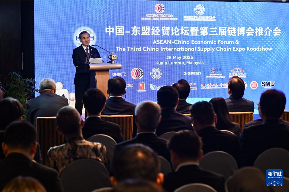 5月26日,在馬來西亞首都吉隆坡,中國貿(mào)促會會長任鴻斌在中國—東盟經(jīng)貿(mào)論壇暨第三屆中國國際供應(yīng)鏈促進(jìn)博覽會(鏈博會)推介會上致辭。新華社記者 程一恒 攝