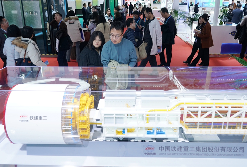 2024年11月27日,人們在第二屆中國國際供應(yīng)鏈促進(jìn)博覽會先進(jìn)制造鏈展區(qū)中國鐵建展臺參觀一款國產(chǎn)超大直徑盾構(gòu)機(jī)模型。新華社記者 張晨霖 攝