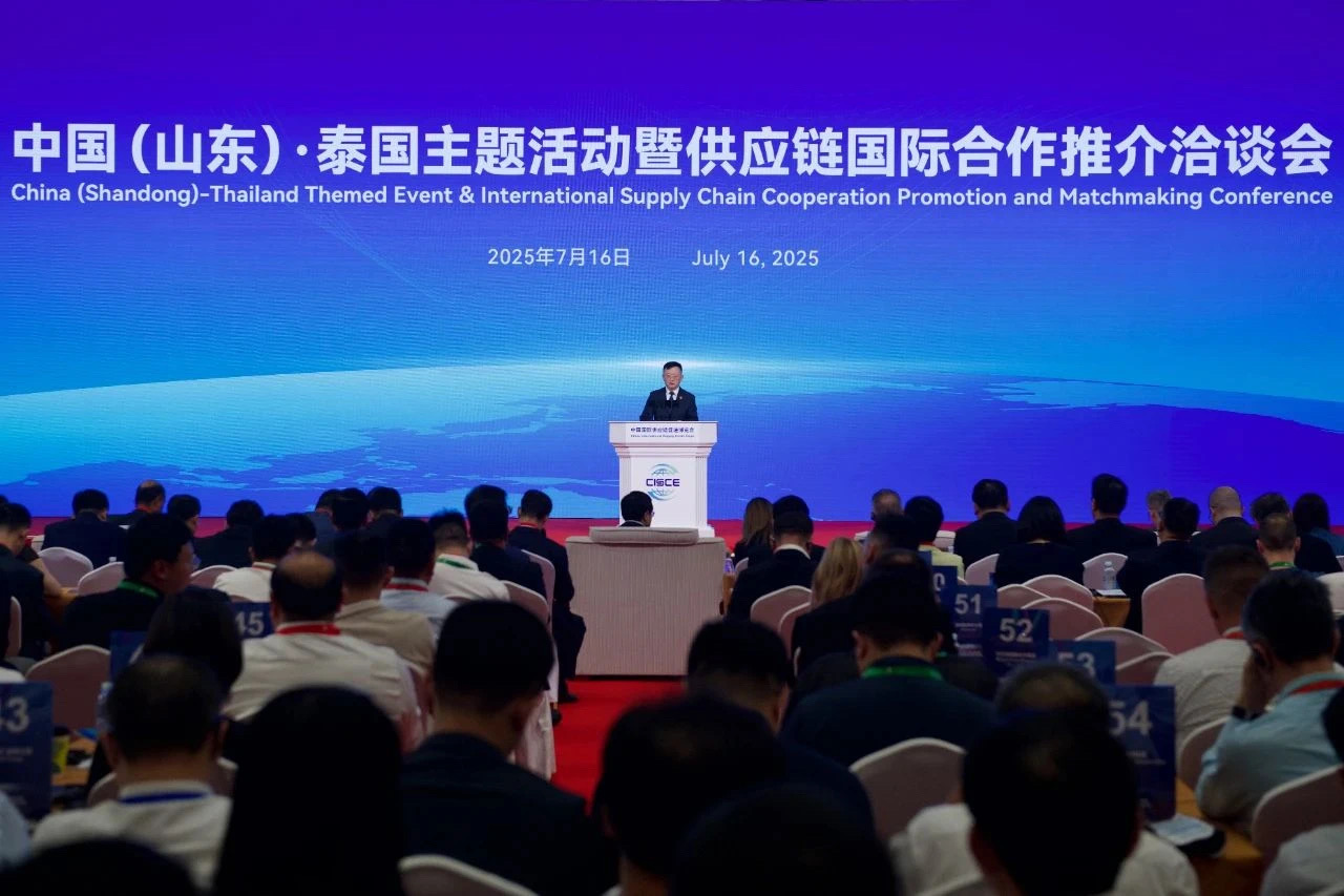 7月16日,在第三屆鏈博會舉辦期間,中國(山東)·泰國主題活動暨供應(yīng)鏈國際合作推介洽談會在北京舉辦。中國貿(mào)促會副會長聶文慧、山東省副省長宋軍繼、泰國商業(yè)部常務(wù)副次長艾卡闡·斯達(dá)瓦拉瀾等中外嘉賓出席并致辭。